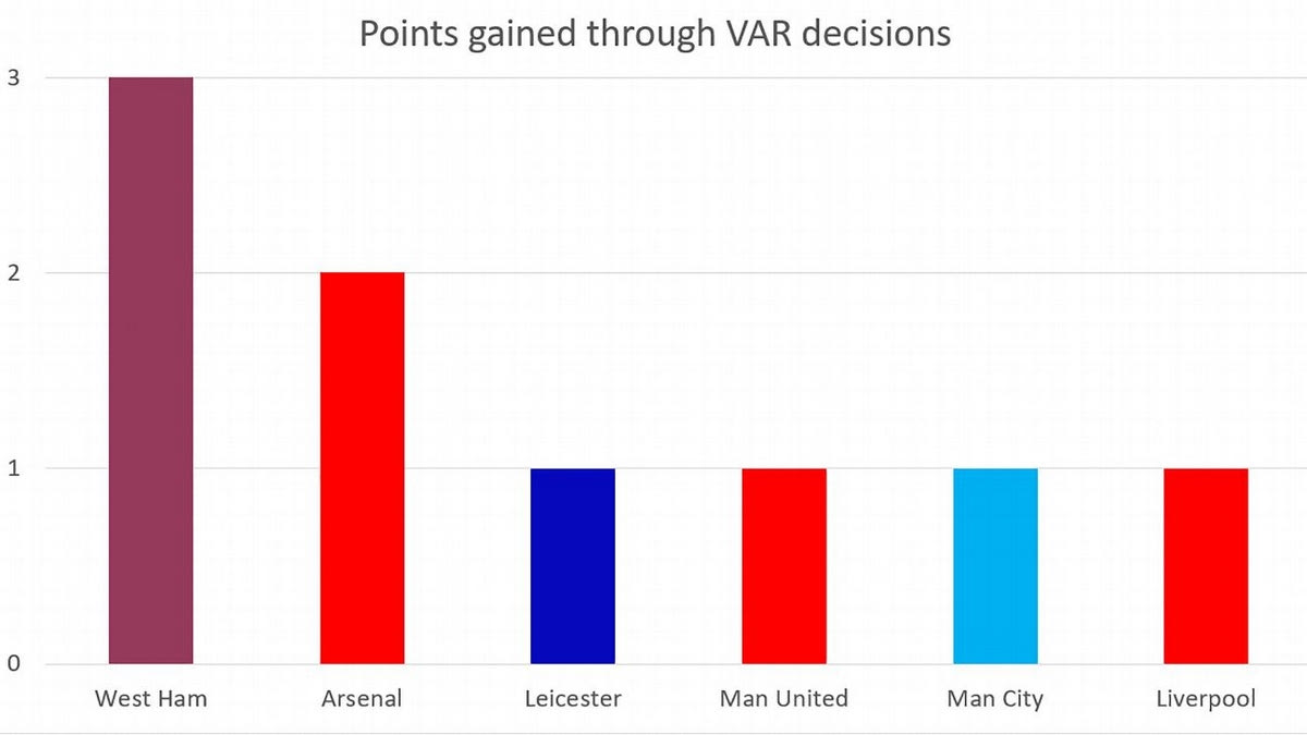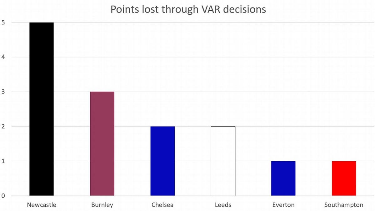 Από εκεί και πέρα, η μεγαλύτερη ευεργετημένη της παρουσίας του VAR είναι η Γουέστ Χαμ καθώς χωρίς αυτό θα είχε τρεις βαθμούς λιγότερους και θα ήταν δύο θέσεις χαμηλότερα για να βρεθεί στην 11η, ενώ στον αντίποδα η ομάδα που έχει υποστεί τη μεγαλύτερη ζημιά από το VAR είναι η Νιούκαστλ, με τις καρακάξες να έχουν δει τέσσερις ανατροπές εις βάρος τους, διπλάσιες από την οποιαδήποτε άλλη ομάδα (θα είχαν πέντε πόντους περισσότερους χωρίς το VAR).