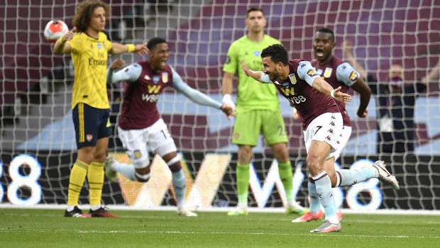 Aston Villa's Trezeguet celebrates after scoring his team's first goal during the English Premier League soccer match between Aston Villa and Arsenal at Villa Park in Birmingham, England, Tuesday, July 21, 2020. (AP Photo/Peter Powell,Pool) AP Photo/Peter Powell,Pool