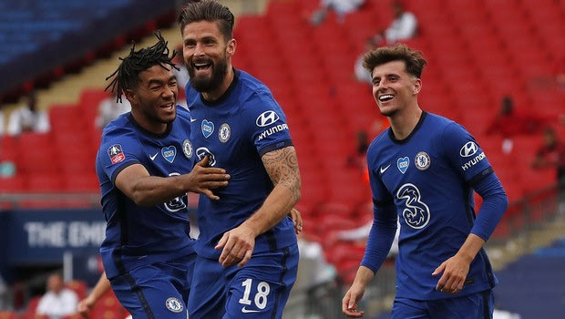 Chelsea's Olivier Giroud, center, celebrates scoring the opening goal during the English FA Cup semifinal soccer match between Chelsea and Manchester United at Wembley Stadium in London, England, Sunday, July 19, 2020. (AP Photo/Alastair Grant, Pool) AP Photo/Alastair Grant, Pool