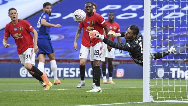 Manchester United's goalkeeper David de Gea makes a save during the English FA Cup semifinal soccer match between Chelsea and Manchester United at Wembley Stadium in London, England, Sunday, July 19, 2020. (Andy Rain, Pool via AP) Andy Rain, Pool via AP