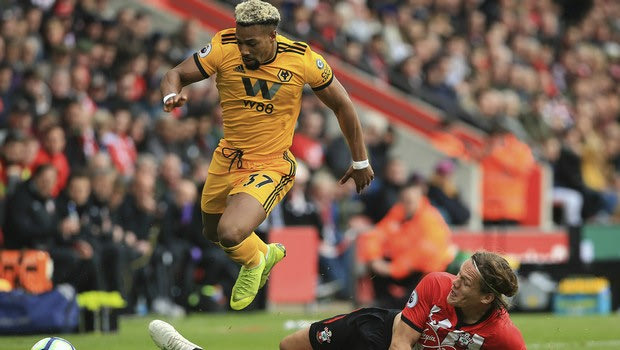 Southampton's Jannik Vestergaard, right, tackles Wolverhampton Wanderers' Adama Traore, during the English Premier League soccer match between Southampton and Wolverhampton Wanderers, at St Mary's Stadium, in Southampton, England, Saturday April 13, 2019. (Mark Kerton/PA via AP) Mark Kerton/PA via AP