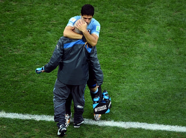 Ο Λουίς Σουάρες αγκαλιά με τον φυσικοθεραπευτή της Ουρουγουάης