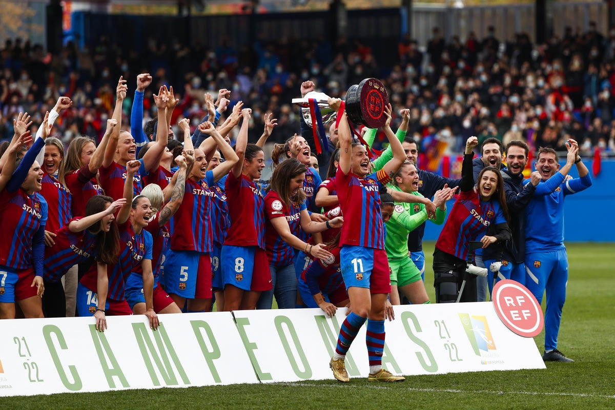Οι παίκτριες της Μπαρτσελόνα πανηγυρίζουν την κατάκτηση της Primera División Femenina 2021-2022 ύστερα από τη νίκη επί της Ρεάλ στο "Γιόχαν Κρόιφ", Βαρκελώνη | Κυριακή 13 Μαρτίου 2022