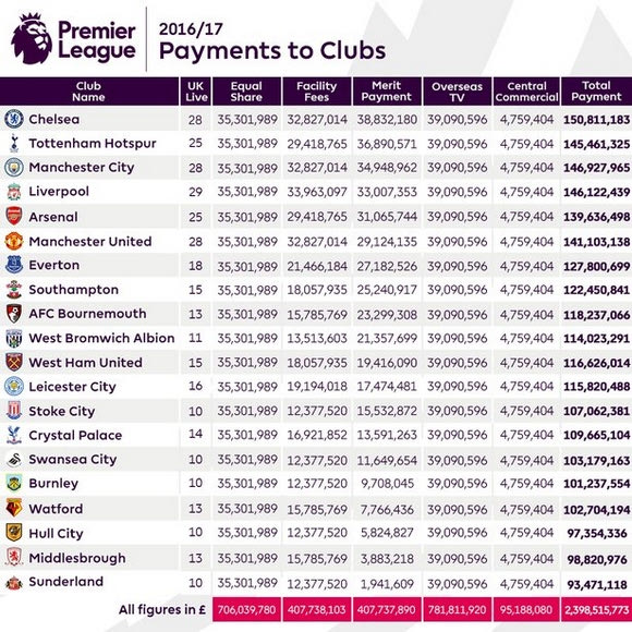 Απ’ το παραπάνω ποσό, το 50% μοιράζεται ισόποσα στις ομάδες, ήτοι 35.301.989 λίρες απ’ την κεντρική διαχείριση, συν 4.759.404 λίρες απ’ τη διαφημιστική πίτα, συν 39.090.596 λίρες απ’ τα δικαιώματα των μεταδόσεων στο εξωτερικό. Αυτό σημαίνει πως το ελάχιστο ποσό που λαμβάνει κάθε ομάδα είναι 79.151.989 λίρες.