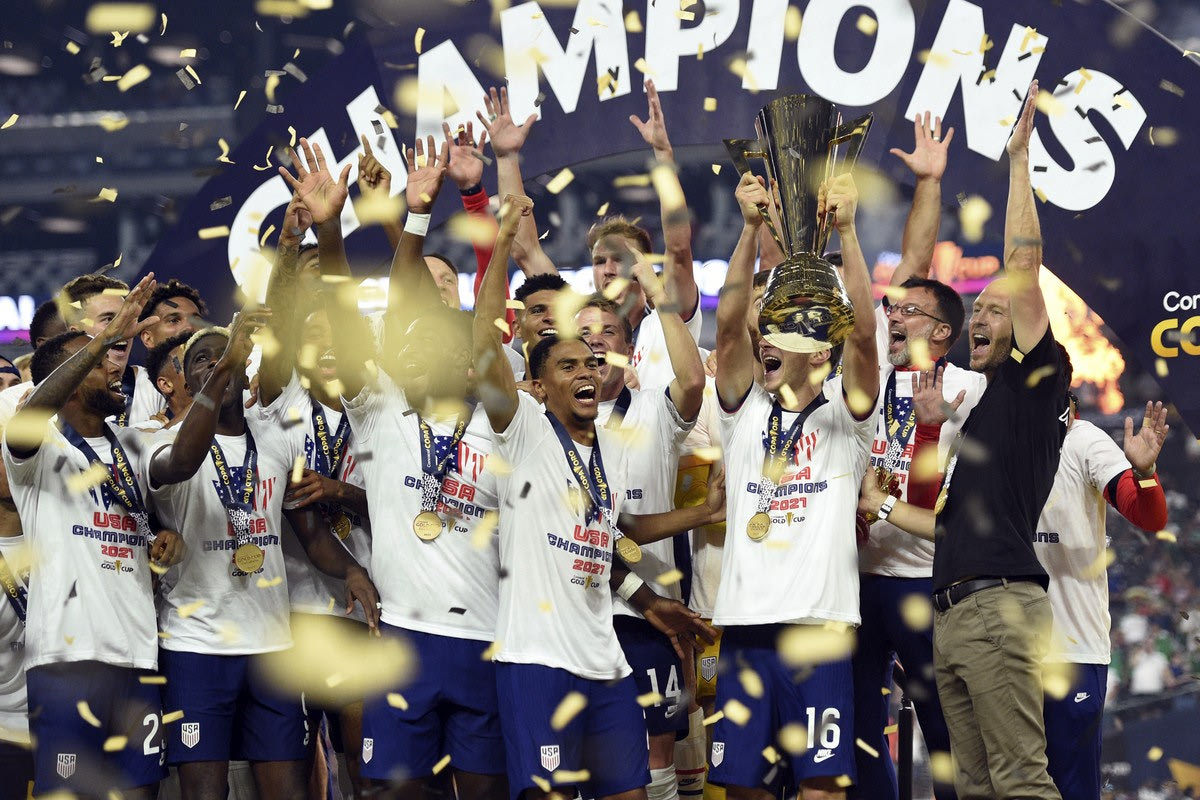 Οι παίκτες των ΗΠΑ πανηγυρίζουν την κατάκτηση του Gold Cup 2021 έπειτα από τη νίκη τους στον τελικό επί του Μεξικού στο "Αλέτζιαντ Στέιντιουμ", Λας Βέγκας