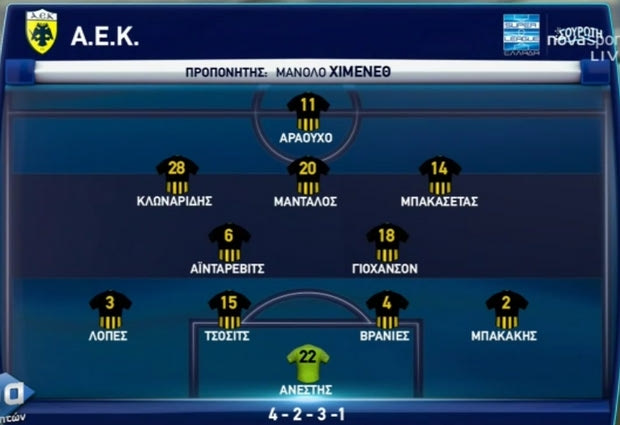 Στον αντίποδα, ο Μανόλο Χιμένεθ επέλεξε κι αυτός ως σύστημα το 4-2-3-1, δίνοντας φανέλα βασικού για πρώτη φορά τη φετινή σεζόν στον Σέρχιο Αραούχο. Παράλληλα, ο Αστρίτ Αϊντάρεβιτς αντικατέστησε τον τραυματία Αντρέ Σιμόες στη μεσαία γραμμή, ενώ ο Τάσος Μπακασέτας επιλέχθηκε αντί του Λάζαρου Χριστοδουλόπουλου για λόγους ξεκούρασης. Ο Πέτρος Μάνταλος είχε το ρόλο του επιτελικού μέσου, πίσω απ’ τον Αραούχο, με τους Κλωναρίδη και Μπακασέτα να κινούνται στα “φτερά” της επίθεσης.