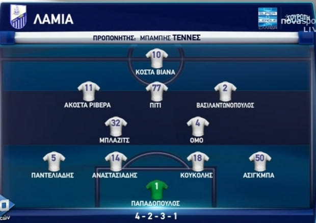 ΛΑΜΙΑ (Μπάμπης Τεννές): Ν. Παπαδόπουλος, Ασίγκμπα, Κουκόλης (90′ Αναστασόπουλος), Αναστασιάδης, Παντελιάδης, Μπλάζιτς, Όμο, Ακόστα, Βασιλαντωνόπουλος (87′ Τσούκαλος), Βάντερσον, Πίτι (84′ Λινάρδος).