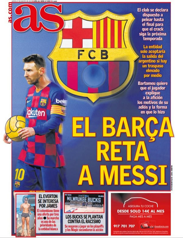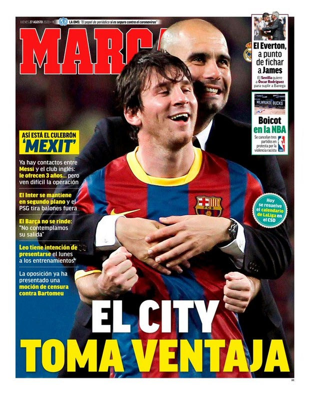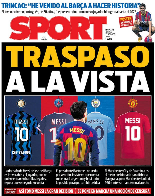 Τέλος, η καταλανική Sport εμφανίζει τις φανέλες των Ίντερ, Παρί, Σίτι και Γιουνάιτεντ με το όνομα του Μέσι και αναφέρει: “Φαίνεται αλλαγή – Ο Μέσι είναι ξεκάθαρος ότι θέλει να φύγει και η πώλησή του μπορεί να τεθεί σε διαπραγμάτευση. Ο Μπαρτομέου επιμένει σε παραμονή του. Ο Γκουαρδιόλα της Σίτι έχει το πλεονέκτημα”.