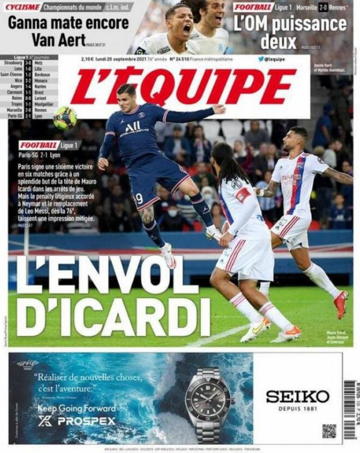 Το πρωτοσέλιδο της Δευτέρας (20/9) της γαλλικής Equipe είναι αφιερωμένο στον θρίαμβο της Παρί Σεν Ζερμέν, η οποία συνεχίζει την παρέλαση στη Ligue 1, κάνοντας το “6 στα 6” την Κυριακή (19/9) μετά τη νίκη επί της Λιόν (2-1) στο Παρκ Ντε Πρενς. Την ίδια στιγμή ωστόσο, τα Μέσα έχει απασχολήσει κι ο Λιονέλ Μέσι.