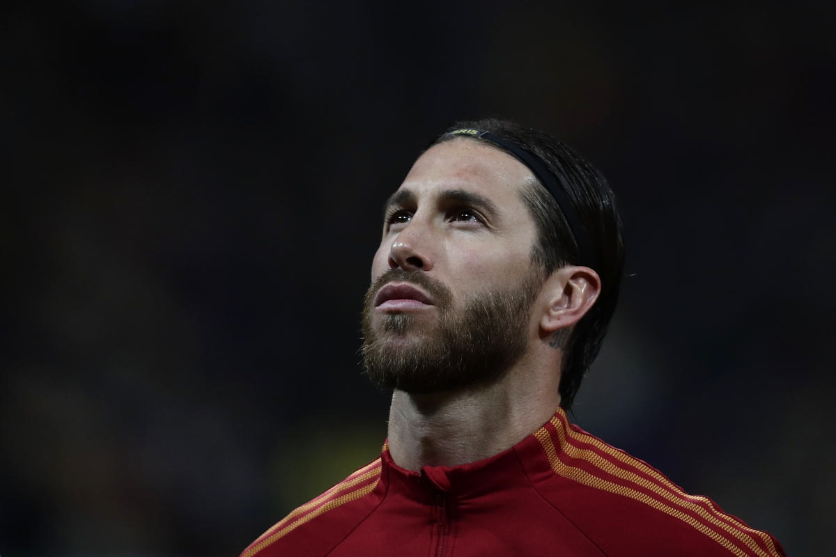 Spain's Sergio Ramos stands on the pitch during the national anthems before the Euro 2020 group F qualifying soccer match between Spain and Romania at the Metropolitano stadium in Madrid, Monday, Nov. 18, 2019. (AP Photo/Manu Fernandez)