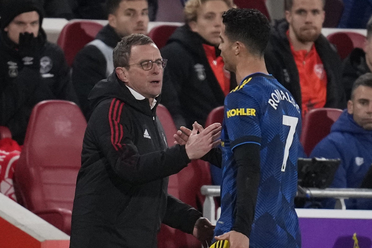 Ο Ρονάλντο με τον Ραλφ Ράνγκνικ κατά την αλλαγή του στο Μπρέντφορντ - Γιουνάιτεντ © 2022 Matt Dunham / AP IMAGES