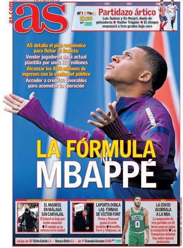 “Επιχείρηση Εμπαπέ” είναι ο τίτλος στο σημερινό (12/1) πρωτοσέλιδο της μαδριλένικης εφημερίδας, που αναφέρει πως η Ρεάλ υπολογίζει πως το κόστος της απόκτησής του θα ανέρχεται σε ένα ποσό από 150 μέχρι 200 εκατομμύρια λίρες, με την Παρί Σεν Ζερμέν να επιθυμεί να “πάρει πίσω” τα 198 εκατομμύρια λίρες που δαπάνησε το 2017 για τον Νεϊμάρ.