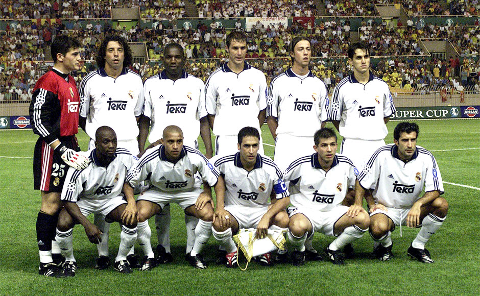 Η ενδεκάδα της Ρεάλ που παρατάχθηκε στο Stade Louis II για τον τελικό του ευρωπαϊκού Σούπερ Καπ. Από αριστερά, πίσω: Κασίγιας, Κάμπο, Γκέρεμι, Ελγκέρα, Γκούτι, Σάβιο. Μπροστά: Μακελελέ, Ρομπέρτο Κάρλος, Ραούλ, Θελάδες, Φίγκο.