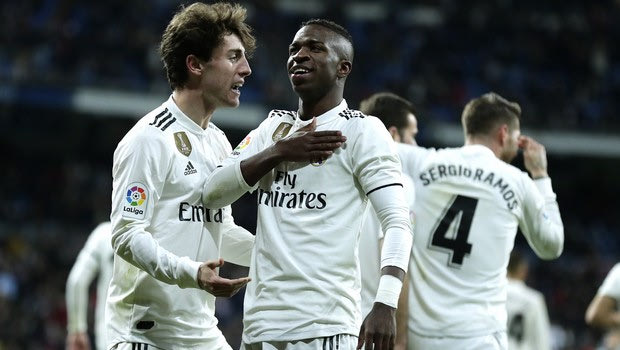 Real Madrid's Vinicius Jr celebrates after scoring during a Spanish Copa del Rey soccer match between Real Madrid and Leganes at the Bernabeu stadium in Madrid, Spain, Wednesday, Jan. 9, 2019. (AP Photo/Manu Fernandez) AP Photo/Manu Fernandez