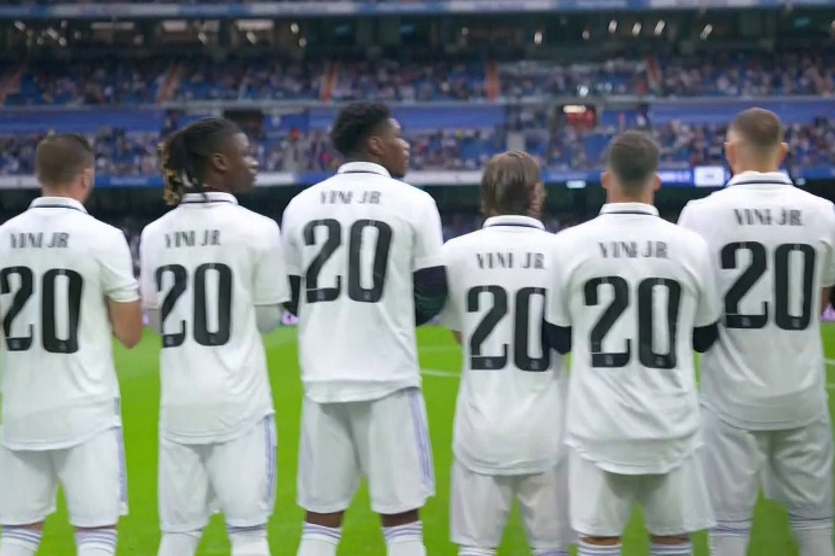 Οι παίκτες της Ρεάλ Μαδρίτης δείχνουν την αλληλεγγύη τους στον συμπαίκτη τους, Βινίσιους Ζούνιορ, καθώς μπήκαν στον αγωνιστικό χώρο φορώντας φανέλα με το όνομά του.