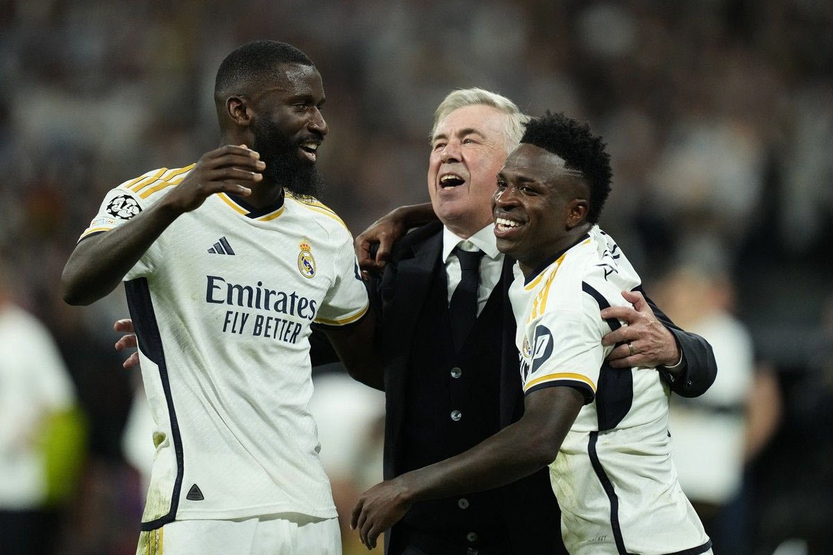Ο Ρίντιγκερ πανηγυρίζει μαζί με Αντσελότι και Βινίσιους μετά τη νίκη επί της Μπάγερν