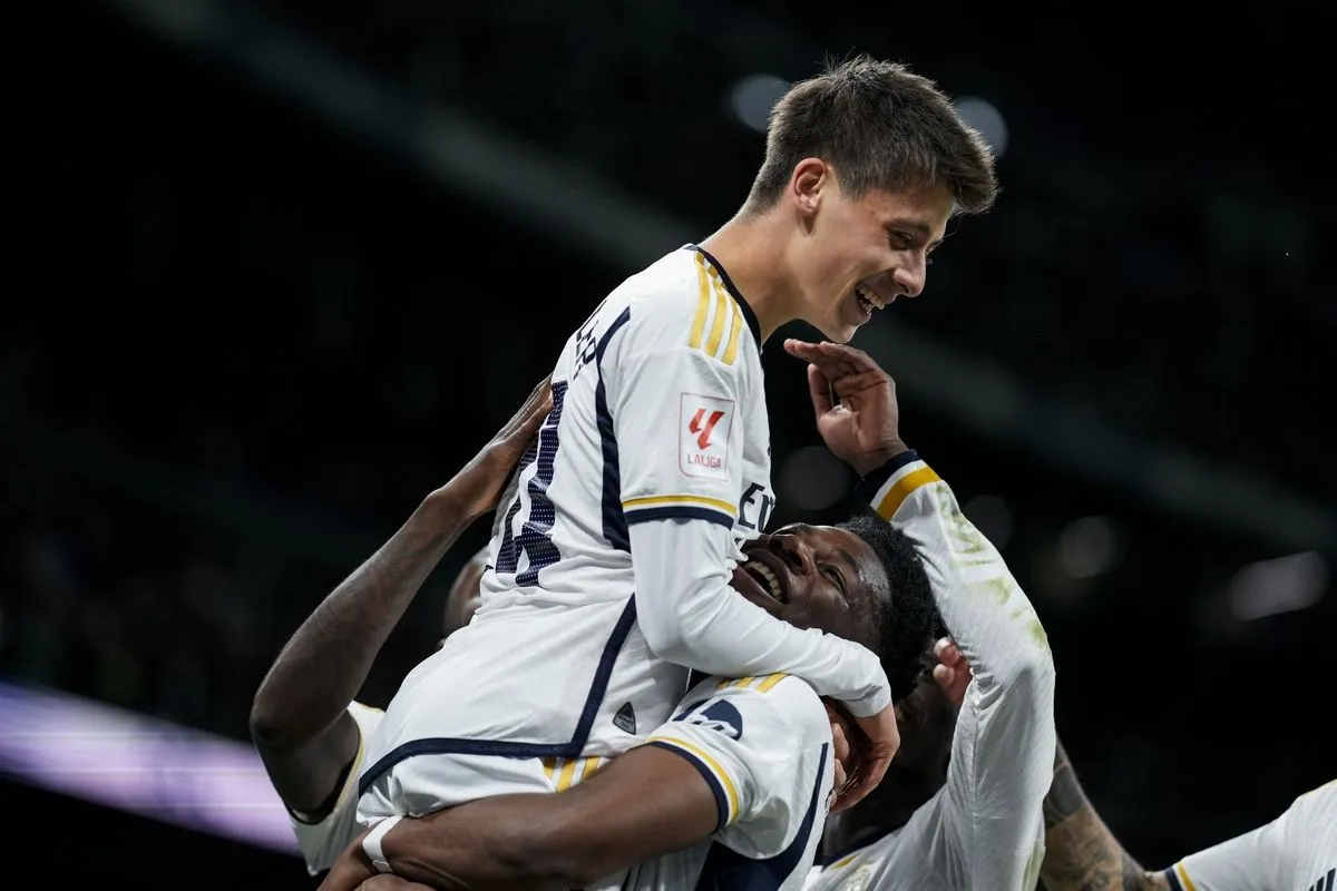 Real Madrid's Arda Guler celebrates with his teammates after scoring his side's fourth goal the Spanish La Liga soccer match between Real Madrid and Celta Vigo at the Santiago Bernabeu stadium in Madrid, Spain, Sunday, March 10, 2024. (AP Photo/Manu Fernandez)