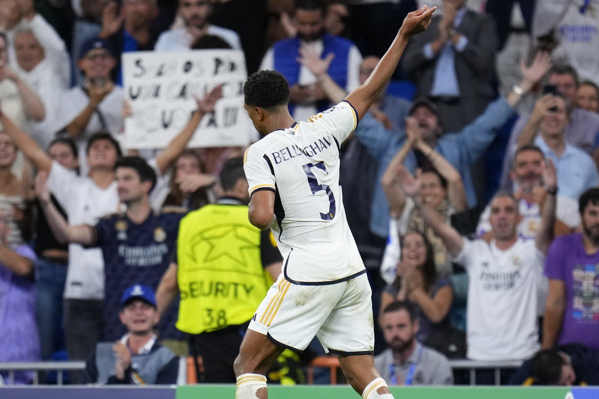Real Madrid's Jude Bellingham celebrates after scoring his side's first goal during the Champions League group C soccer match between Real Madrid and FC Union Berlin at the Santiago Bernabeu stadium in Madrid, Wednesday, Sept. 20, 2023. (AP Photo/Manu Fernandez)