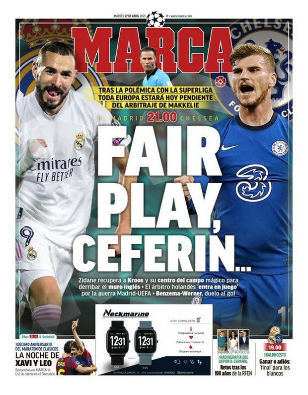 Καλού-κακού πάντως η “Marca” θέλησε να στείλει προειδοποιητικό μήνυμα στον πρόεδρο της UEFA ενόψει του πρώτου αγώνα των δύο ομάδων ώστε να μην υπάρχει κάποιο διαιτητικό παρατράγουδο, με τη μαδριλένικη εφημερίδα που πρόσκειται στους μερένγκες να αναφέρει στο πρωτοσέλιδο της Τρίτης (27/4). “Fair Play Τσέφεριν…”