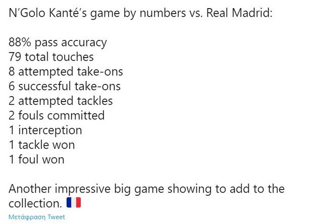 Ο Ενγκολό Καντέ ήταν ένας εκ των κορυφαίων για την Τσέλσι στην αναμέτρηση με τη Ρεάλ Μαδρίτης, συμβάλλοντας τα μέγιστα στην πολύ καλή εικόνα της ομάδας του Τόμας Τούχελ.