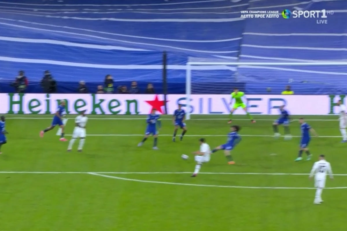 Η Ρεάλ διπλασίασε τα τέρματά της κόντρα στην Τσέλσι στο 79′. Μετά από χαμηλή εκτέλεση κόρνερ, ο Μόντριτς έδωσε στον Κρόος. Ο Γερμανός μέσα στην περιοχή τροφοδότησε τον Βινίσιους, που έβγαλε έξω στον Ασένσιο. Ο Ισπανός πλάσαρε εκτός περιοχής με τον Φοφανά και τον Κέπα να μην μπορούν να κόψουν.