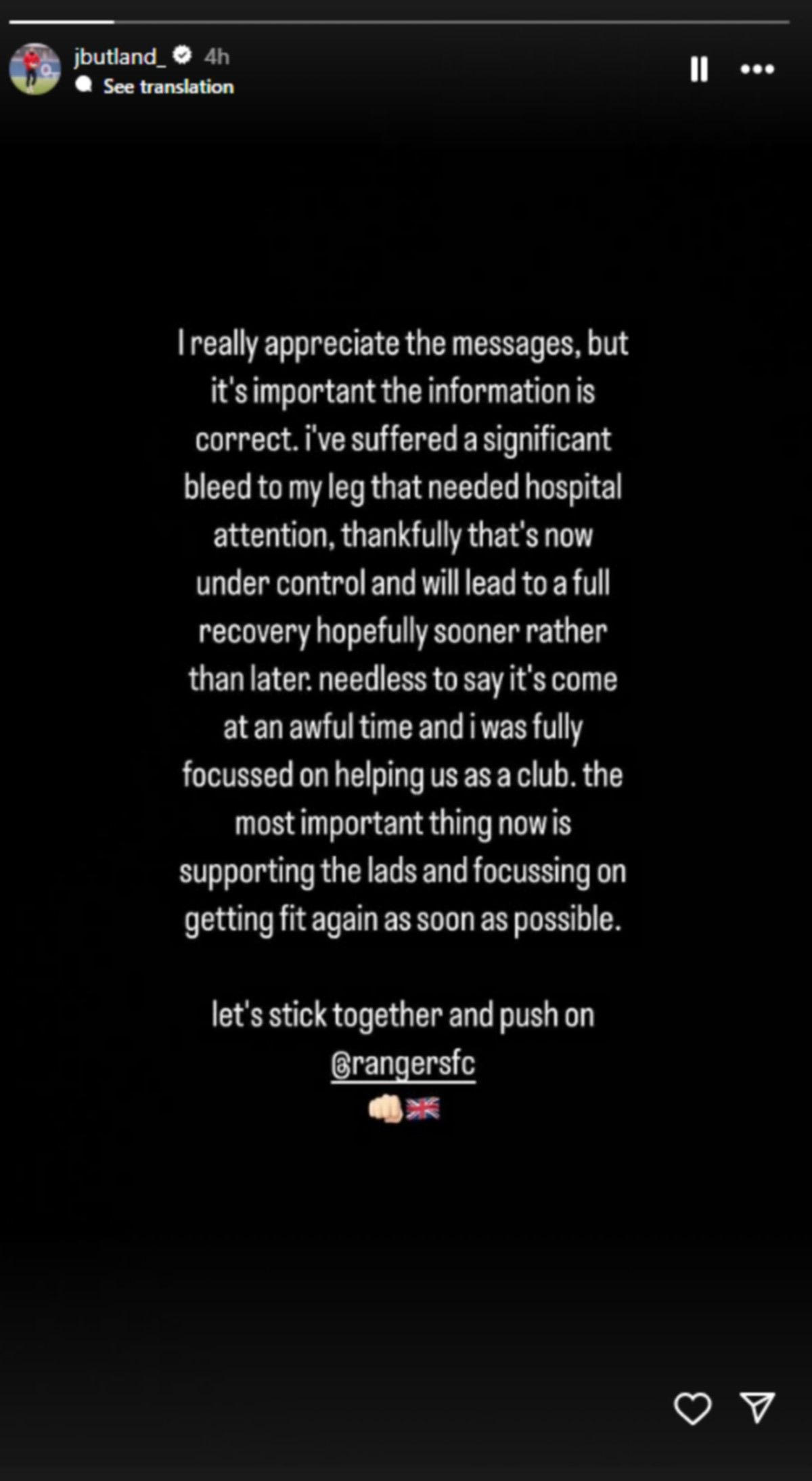 Η Ρέιντζερς θα στερηθεί τις υπηρεσίες του βασικού κίπερ της στο ντέρμπι πρωταθλήματος με την Σέλτικ την Πέμπτη (2/1), με τους "τζερς" να γνωστοποιούν πως ο Τζακ Μπάτλαντ μπήκε εσπευσμένα στο νοσοκομείο λόγω εσωτερικής αιμορραγίας στο πόδι.