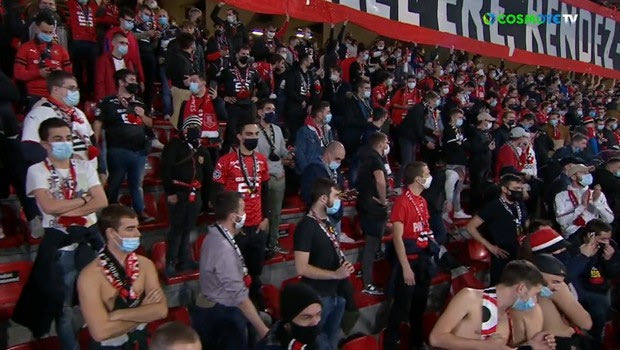 Εν αντιθέσει με το Stade de France του Παρισιού είναι άδειο λόγω κορονοϊού, το Roazhon Park έχει κόσμο στις εξέδρες, με τους φίλους της Ρεν να κάθονται ο ένας δίπλα στον άλλον.