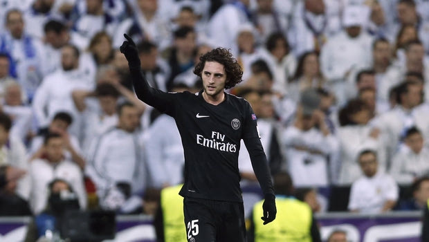 PSG's Adrien Rabiot celebrates after scoring the opening goal during a Champions League Round of 16 first leg soccer match between Real Madrid and Paris Saint Germain at the Santiago Bernabeu stadium in Madrid, Spain, Wednesday, Feb. 14, 2018. (AP Photo/Francisco Seco) AP Photo/Francisco Seco