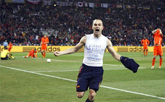 Ο Ινιέστα έχει σκοράρει στο 116′ της παράτασης και πανηγυρίζει. Η φανέλα γράφει “Ντάνι Χάρκε, πάντα μαζί μας” (11/7/2010)