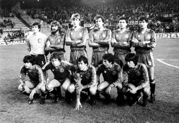 Η Εθνική Ισπανίας που αντιμετώπισε την Ολλανδία στη Σεβίλλη για τα προκριματικά του EURO 1984. Πίσω, από αριστερά: Αρκονάδα, Χουάν Χοσέ, Μαθέδα, Γκοϊκοετσέα, Γορδίγιο, Καμάτσο. Μπροστά, από αριστερά: Μάρκος, Βίκτορ, Σαράμπια, Σενιόρ, Καράσκο (16/2/1983)
