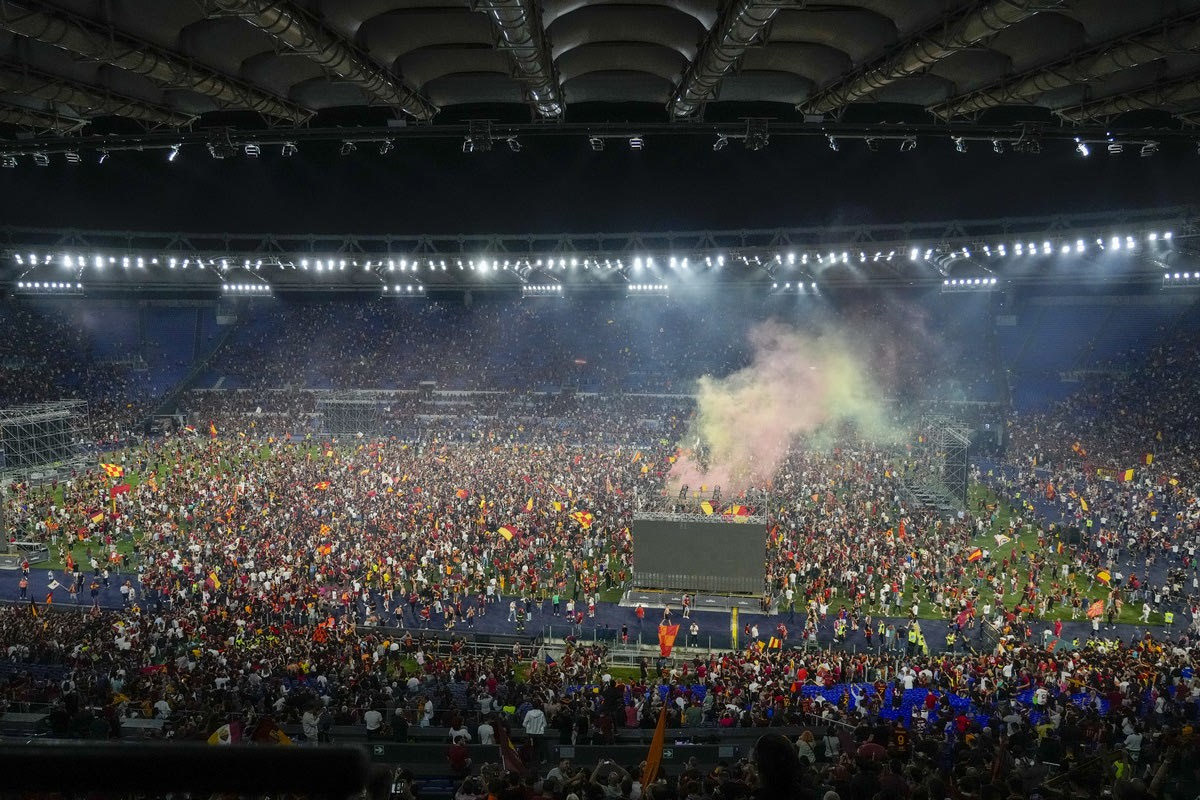 Οι οπαδοί της Ρόμα πανηγυρίζουν στο Ολίμπικο την κατάκτηση του Conference League AP Photo/Gregorio Borgia