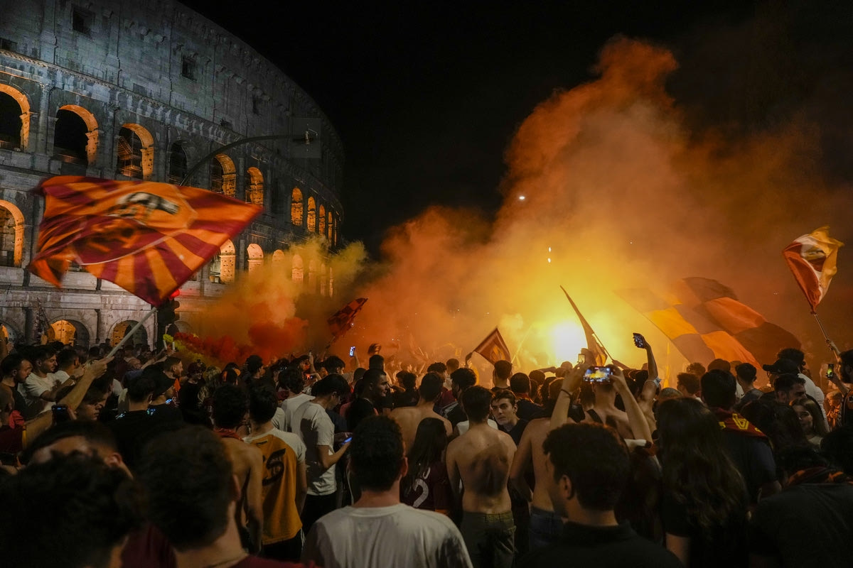Οι φίλοι της Ρόμα πανηγυρίζουν μπροστά από το Κολοσσαίο την κατάκτηση του Europa Conference League