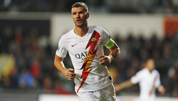 Roma's captain Edin Djeko runs to celebrate after scoring against Basaksehir during an Europa League Group J soccer match between Basaksehir and Roma, in Istanbul, Thursday, Nov. 28, 2019. (AP Photo/Lefteris Pitarakis)