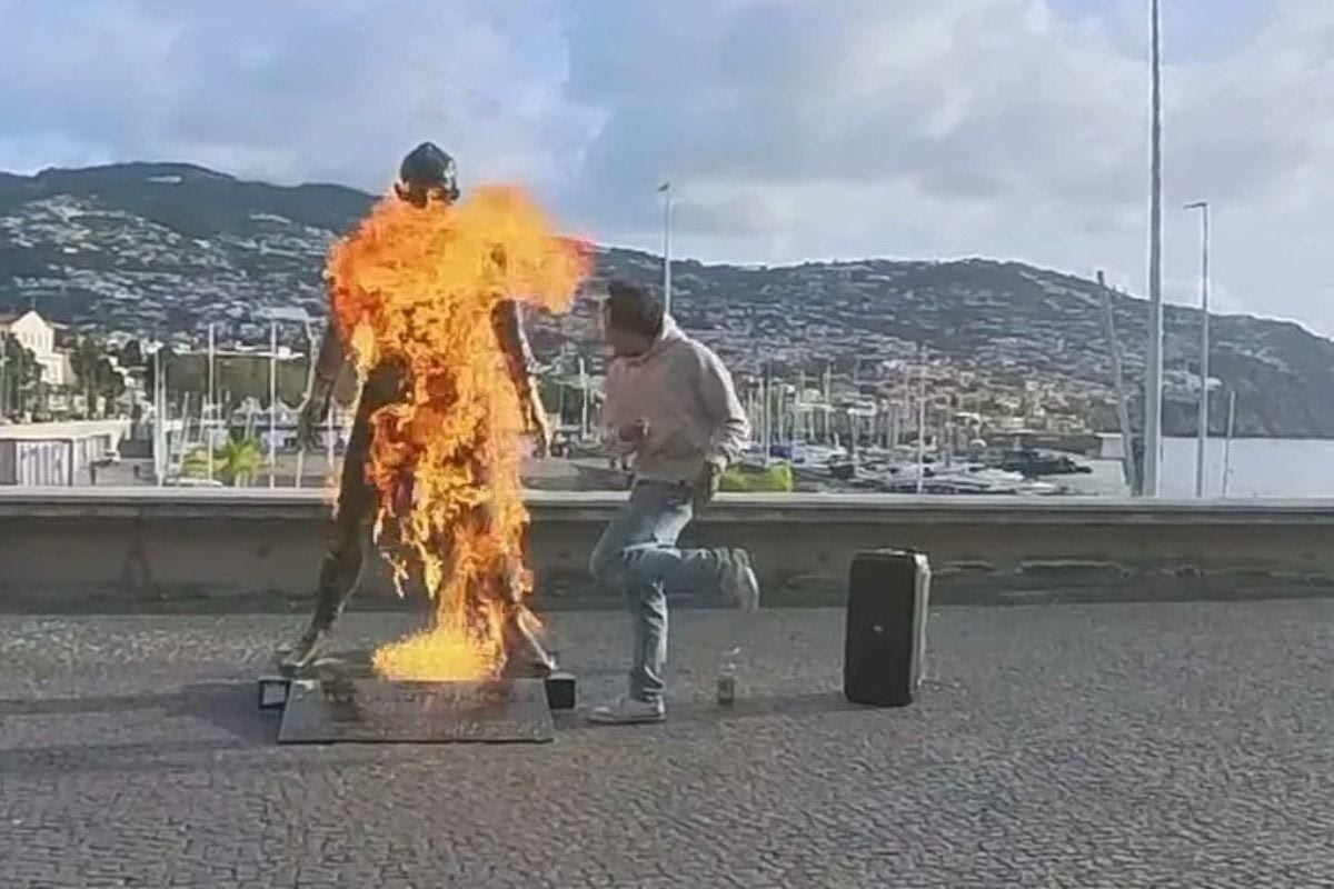 Σε βίντεο που κυκλοφόρησε στα social media, ένας νεαρός άνδρας εμφανίζεται να ρίχνει εύφλεκτο υγρό πάνω στο μπρούτζινο άγαλμα του Πορτογάλου σούπερ σταρ και στη συνέχεια να του βάζει φωτιά με αναπτήρα. Οι φλόγες τύλιξαν για λίγα δευτερόλεπτα το άγαλμα, προτού σβήσουν, ενώ ο ίδιος απομακρύνθηκε χορεύοντας προκλητικά υπό τους ήχους ραπ μουσικής που έπαιζε από φορητό ηχείο.