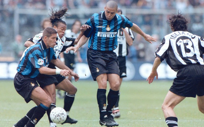 Ρονάλντο, Σιμεόνε, Ντάβιντς και Ιουλιάνο σε στιγμιότυπο από το περιβόητο Γιουβέντους-Ίντερ της σεζόν 1997-98 που σημαδεύτηκε από τη διαιτησία και έκρινε σε μεγάλο βαθμό το σκουντέτο