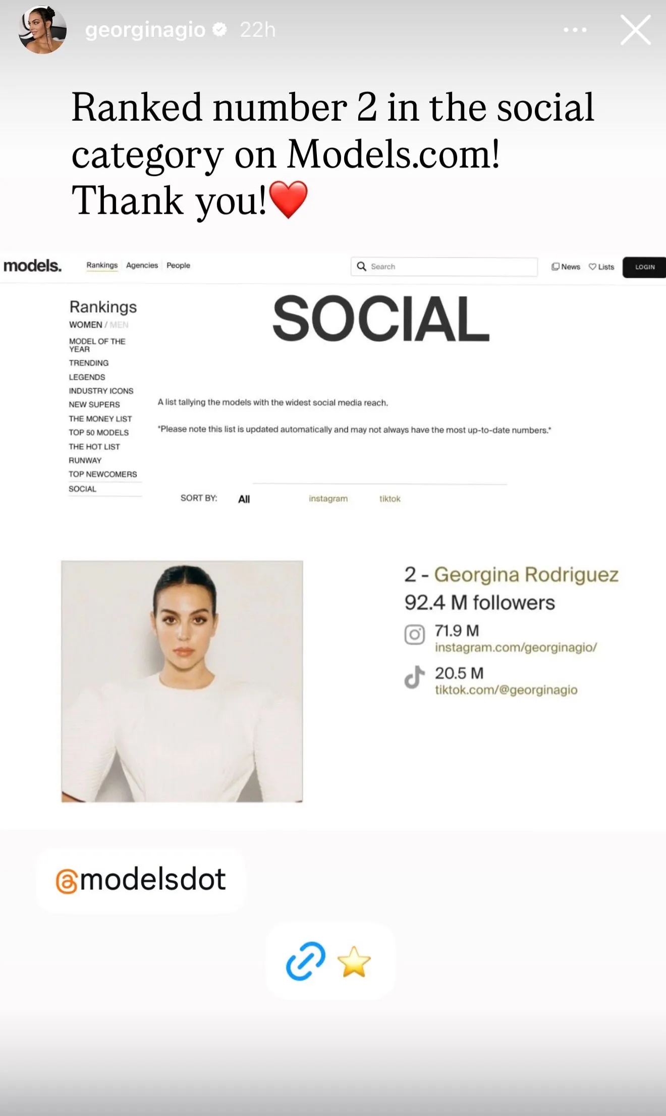 Η σύντροφος του Κριστιάνο Ρονάλντο συγκαταλέγεται πλέον ανάμεσα στα μεγαλύτερα ονόματα της μόδας και της ψηφιακής επιρροής. Σύμφωνα με την κατάταξη του Models.com, η Χεορχίνα Ροντρίγκες βρίσκεται στη 2η θέση της κατηγορίας social, με συνολικά 92,4 εκατομμύρια ακολούθους σε Instagram και TikTok.