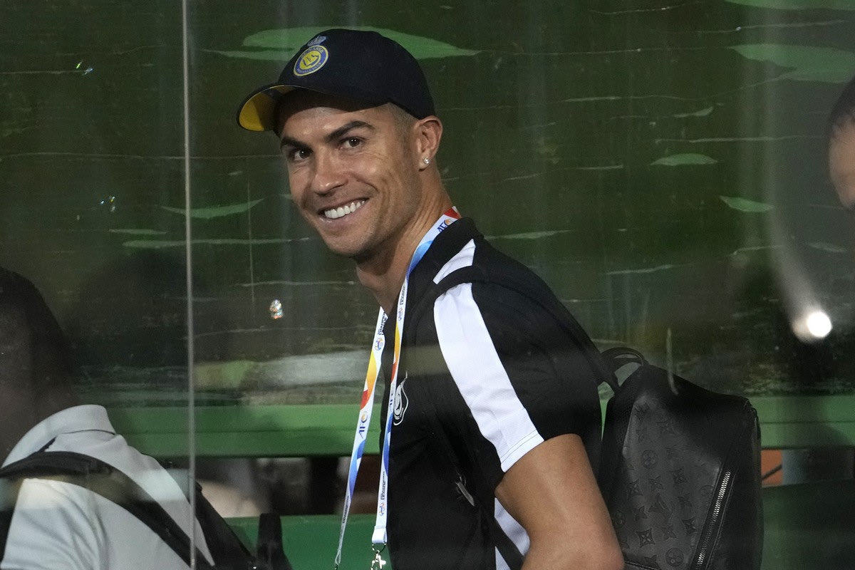Saudi Arabian Al Nassr's Cristiano Ronaldo, center, smiles as he arrives at the Azadi Stadium prior to the AFC Champions League soccer match against Iran's Persepolis in Tehran, Iran, Tuesday, Sept. 19, 2023. (AP Photo/Vahid Salemi)