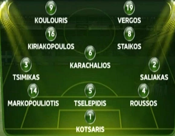Ο Έλληνας τεχνικός επέλεξε σύστημα 3-5-2 θέλοντας να αποκτήσει υπεραριθμία στην μεσαία γραμμή, ενώ στην βασική ενδεκάδα βρέθηκαν οι Κότσαρης, Σάλιακας, Τσιμίκας, Τσελεπίδης, Μαρκοπουλιώτης, Κυριακόπουλος, Ρούσσος, Καραχάλιος, Στάικος, Κουλούρης και Βέργος.