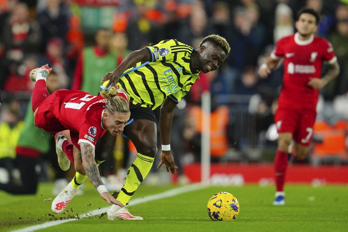 Ο Κώστας Τσιμίκας της Λίβερουλ μονομαχεί με τον Μπουκαγιό Σακά της Άρσεναλ για την Premier League 2023-2024 στο "Άνφιλντ", Λίβερπουλ | Σάββατο 23 Δεκεμβρίου 2023
