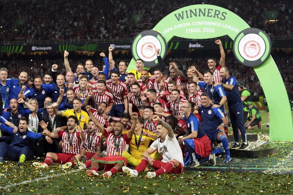Οι παίκτες του Ολυμπιακού πανηγυρίζουν με το τρόπαιο του Europa Conference League 2024-2025 στην OPAP Arena | Τετάρτη 29 Μαΐου 2024