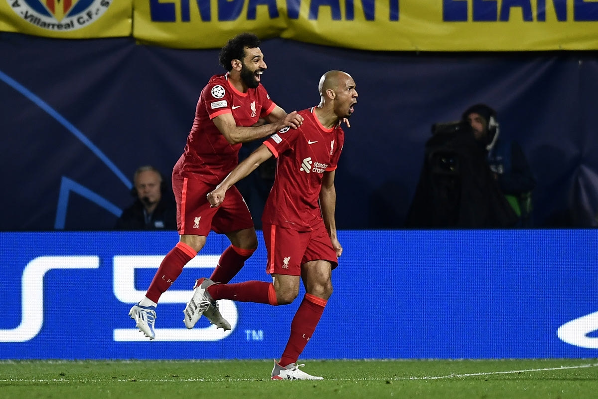 Οι Σαλάχ και Φαμπίνιο πανηγυρίζουν γκολ της Λίβερπουλ κόντρα στην Βιγιαρεάλ | 3 Μαΐου 2022 @2022 Jose Breton/AP IMAGES