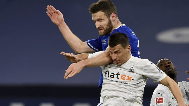 Ο Σκοντράν Μουστάφι της Σάλκε μονομαχεί με τον Στέφαν Λάινερ της Γκλάντμπαχ σε αναμέτρηση για την Bundesliga 2020-2021 στη "Φέλτινς Αρένα", Γκελζενκίρχεν | Σάββατο 20 Μαρτίου 2021 © 2021 Guido Kirchner/Associated Press