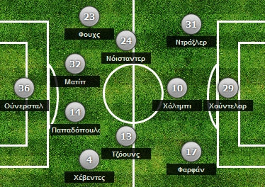 Σάλκε (Χουμπ Στέφενς): Ούνερσταλ, Χέβεντες, Παπαδόπουλος, Ματίπ, Φουχς, Τζόουνς, Νόισταντερ, Φαρφάν, Χόλτμπι (71′ Πούκι), Ντράξλερ (89′ Μπαρνέτα), Χούντελαρ (90+1′ Μάρικα).