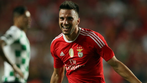 Benfica's Samaris, celebrates after scoring his team's second goal against Moreirense during a Portuguese league soccer match at Benfica's Luz stadium in Lisbon, Saturday, Aug. 29, 2015. (AP Photo/Steven Governo)