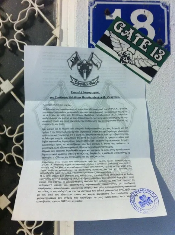 Τα γραφεία τόσο της Νομαρχιακής Επιτροπής του ΣΥΡΙΖΑ όσο και του Υφυπουργού Αθλητισμού στην Ζάκυνθο ήταν κλειστά και οι οπαδοί των πράσινων θυροκόλλησαν την την επιστολή διαμαρτυρίας.