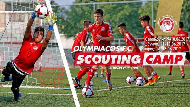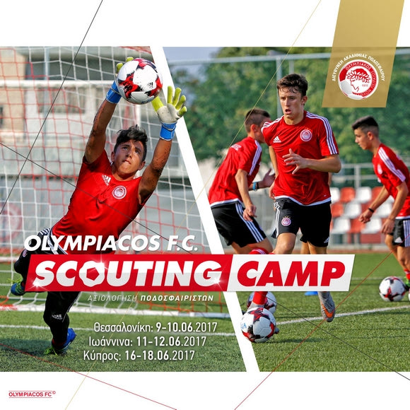 “Η Διεύθυνση Ακαδημίας της ΠΑΕ Ολυμπιακός σε συνεργασία με τις Σχολές Θεσσαλονίκης, Ιωαννίνων και Κύπρου διοργανώνει «Scouting Camp» σε Θεσσαλονίκη (9-10 Ιουνίου), Ιωάννινα (11-12 Ιουνίου) και Κύπρο (16-18 Ιουνίου).