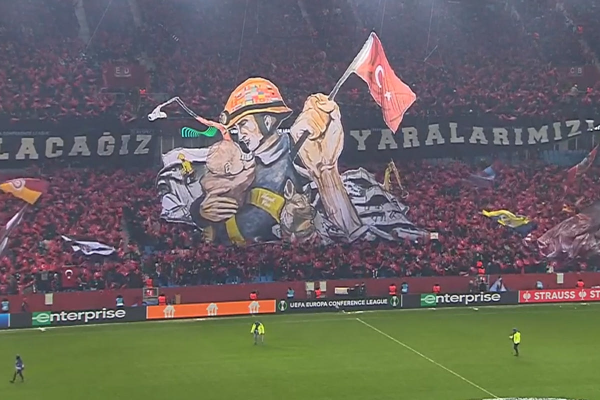 Ένα συγκλονιστικό κορεό ανέβασαν οι οπαδοί της Τράμπζονσπορ, στο οποίο αποτυπώνουν τον πόνο που βίωσε η χώρα λόγω του φονικού σεισμού. Ένας διασώστης με τη σημαία της Τουρκίας και τις σημαίες των άλλων χωρών (και της ελληνικής) στο κράνος του, σώζει ένα βρέφος από τα συντρίμμια.