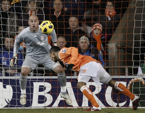 Blackpool's DJ Campbell (R) scores past Liverpool keeper Pepe Reina during their English Premier League soccer match at Bloomfield Road in Blackpool, northern England, January 12, 2011. REUTERS/Phil Noble (BRITAIN - Tags: SPORT SOCCER) NO ONLINE/INTERNET USAGE WITHOUT A LICENCE FROM THE FOOTBALL DATA CO LTD. FOR LICENCE ENQUIRIES PLEASE TELEPHONE ++44 (0) 207 864 9000
