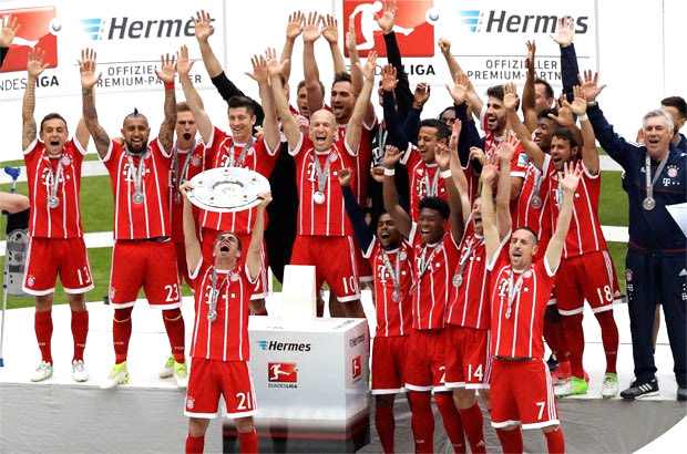 Ο Φίλιπ Λαμ σηκώνει το τρόπαιο του περσινού πρωταθλήματος (2016/17), ενώ οι συμπαίκτες του πανηγυρίζουν (AP Photo/Matthias Schrader)