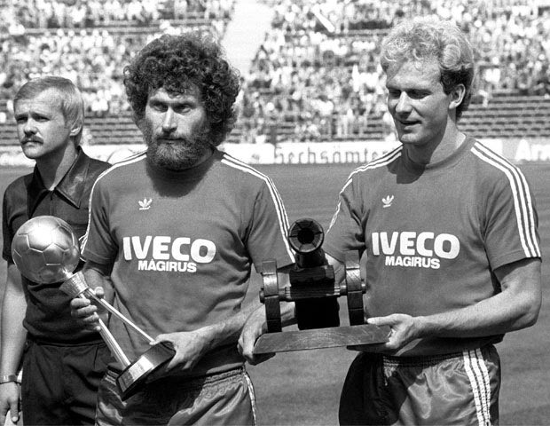 Η Μπάγερν είναι ο σύλλογος με τα περισσότερα πρωταθλήματα (26) στην ιστορία της Bundesliga. Εδώ, δυο ζωντανοί μύθοι της ομάδας του Μονάχου. Αριστερά, ο Πάουλ Μπράιτνερ με το βραβείο του καλύτερου παίκτη της σεζόν 1980/81 και δίπλα του, ο Καρλ Χάιντς Ρουμενίγκε με το βραβείο του πρώτου σκόρερ του πρωταθλήματος (AP Photo/Wolfgang Rattay)